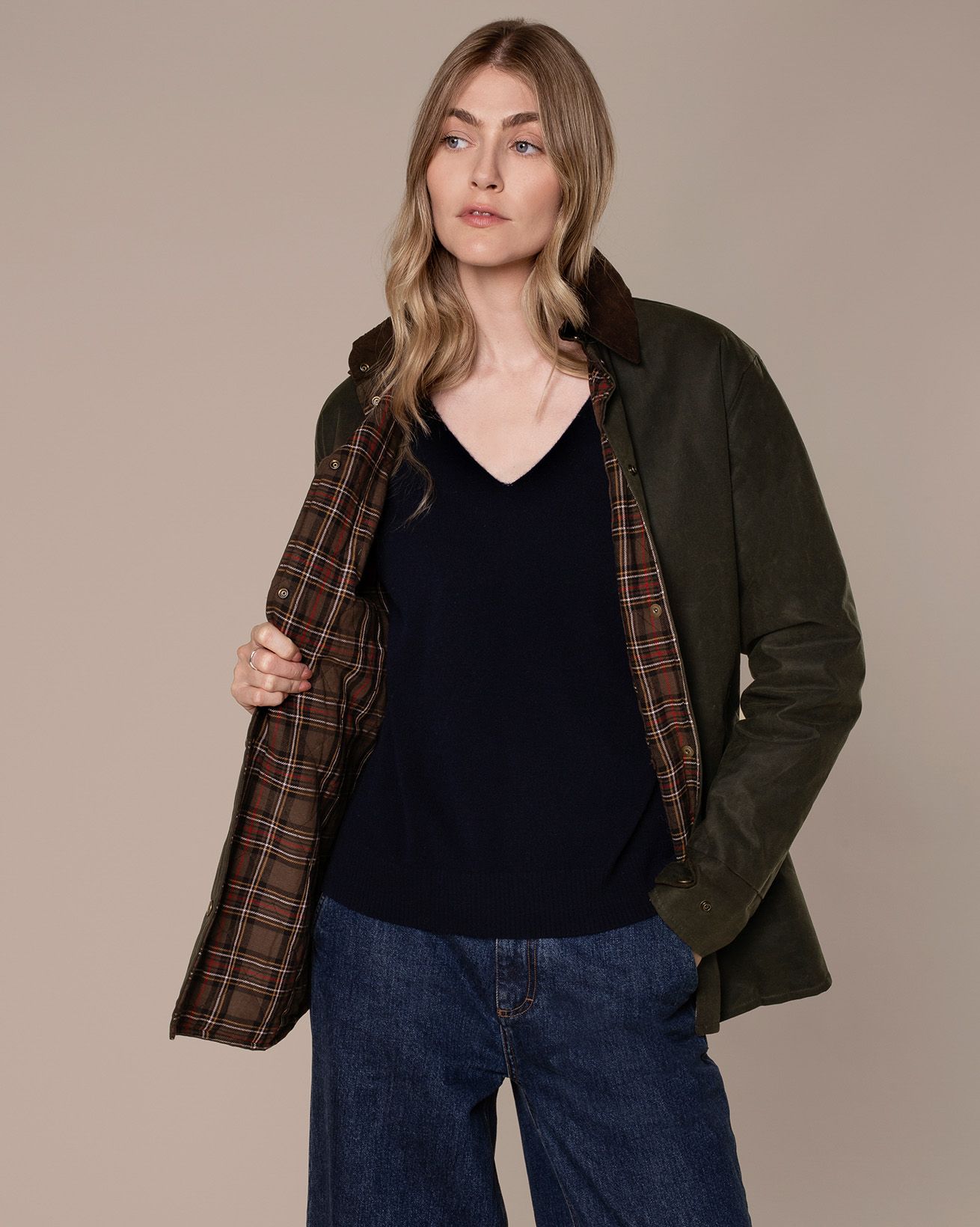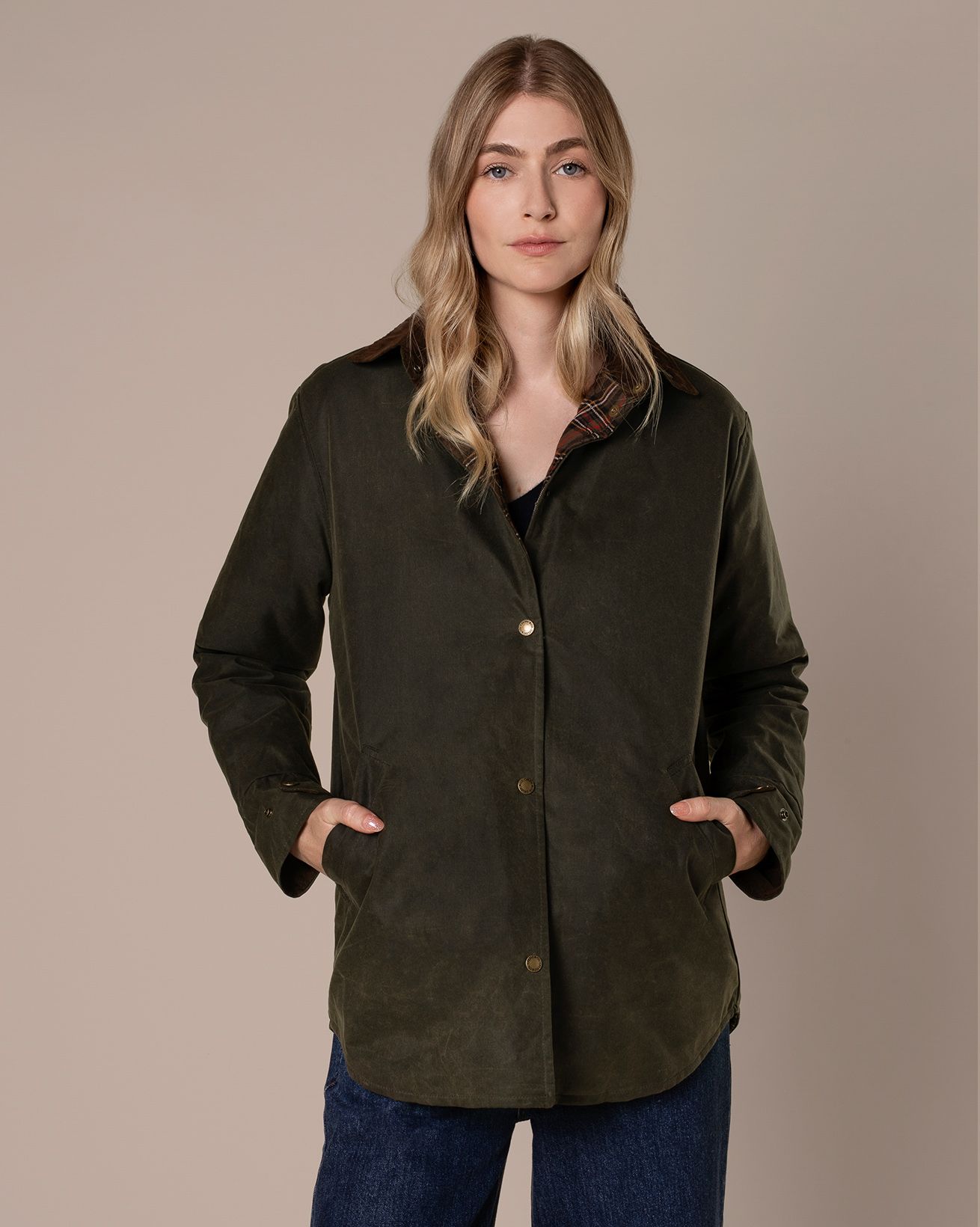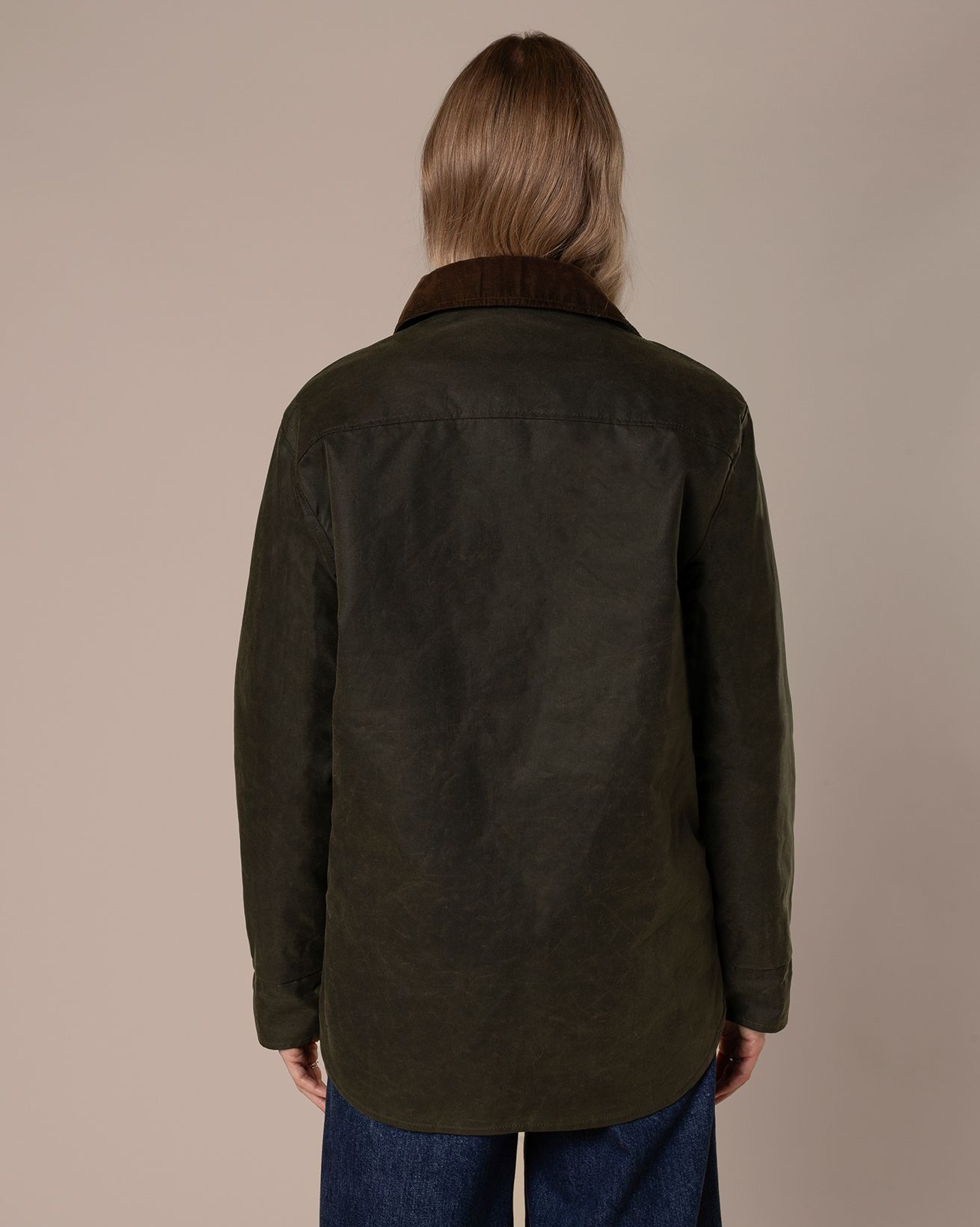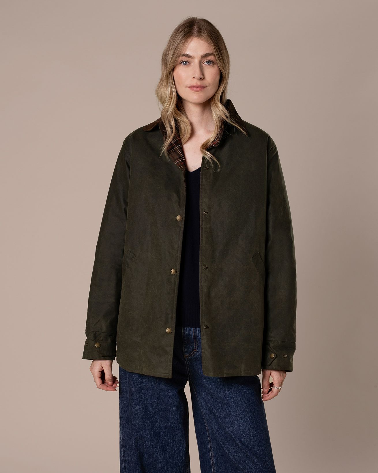 Details include a curved hem and yoke panel at the back, a contrast cord collar, popper fastening down the front and adjustable cuff straps. We’ve added broad welt pockets and an internal patch pocket for practicality, making this the perfect all-day over-layer.